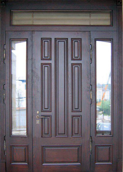 Парадные двери относятся к изделиям премиум-класса. Изготавливаются такие модели из металла толщиной не менее 2,0 мм, конструкция усиливается ребрами жесткости. Основной фактор, делающий парадные двери таковыми – их внешняя отделка. Для декора этих дверей, как правило, используют массив дуба, ясеня или сосны, натуральный шпон, корабельную фанеру, МДФ-панель, покрытую атмосфероустойчивой пленкой Винорит (VINORIT). Декоративные вставки из антивандального стекла, с применением элементов ковки, рисунок, который будет сочетаться с рисунком решеток на окнах, придаст коттеджу неповторимый внешний вид. Можно декорировать дверь витражным узором – и ваш дом заиграет яркими красками. По конструкции парадные двери могут быть как одностворчатыми, так и двустворчатым. При достаточной высоте проема, можно изготовить входную группу с декоративной вставкой сверху – прямоугольную или в виде арки. Терморазрыв в конструкции парадной двери сохранит тепло в доме, и предотвратит промерзание и кондедсирование двери в холодное время года, при этом не требуется обустройство в доме холодного тамбура.