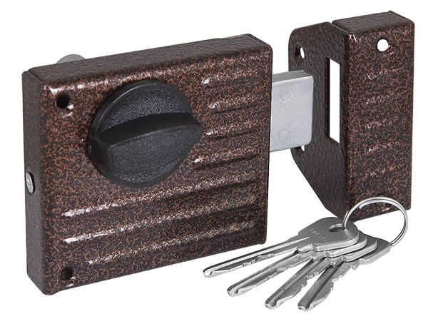 Замок накладной цилиндровый ЗН 1-2.1 рекомендован для деревянных дверей. Корпус замка и ригель выполнены из стали. Изнутри замок запирается ручкой. 2 класс секрета. Количество секретных комбинаций: 15 000. Один прямоугольный ригель размером 9x28 мм. Цвет: медь. Комплектация: замок, цилиндровый механизм МЦ-1, 4 английских ключа, ответная планка, 1 накладка, крепежная фурнитура.